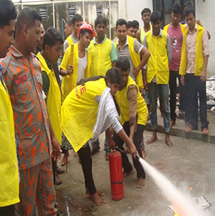 Our factory has fire evacuation plans in each floor and regular fire drills are carried out and timed. Required numbers of fire extinguishers are in place in the factories. Fire alarm bells are installed in different places of the building and the bells are regularly checked. It’s our policy to keep Fire Exits open even when there is one member of the staff in the factory building.